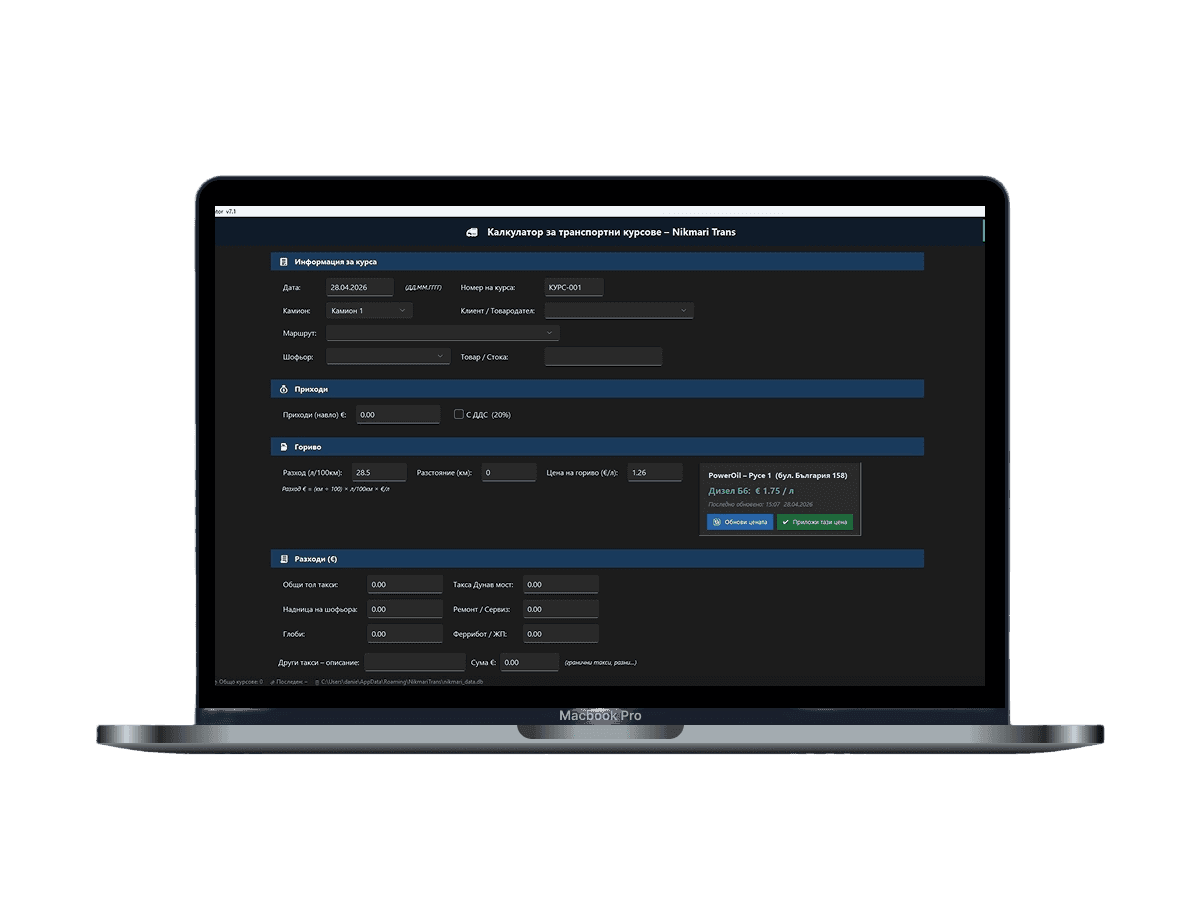 Приложение за изчисляване и проследяване на приходи и разходи по товари. Помага на транспортни фирми да следят рентабилността на всяка превозна операция. · 2025